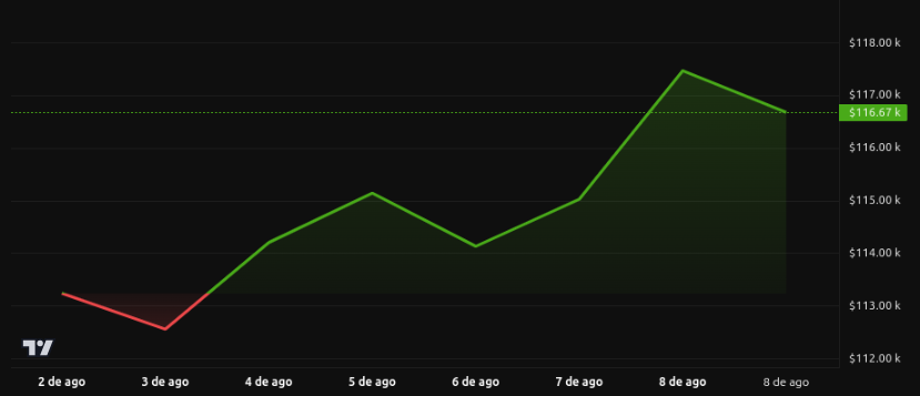 O Bitcoin começou a semana consolidando-se próximo a US$ 114 mil, impulsionado pelo otimismo em relação a um possível corte de taxas. Essa tendência culminou hoje com um avanço de 2%, alcançando quase US$ 117 mil após o anúncio da Ordem Executiva de Trump que abriu fluxos institucionais de longo prazo.