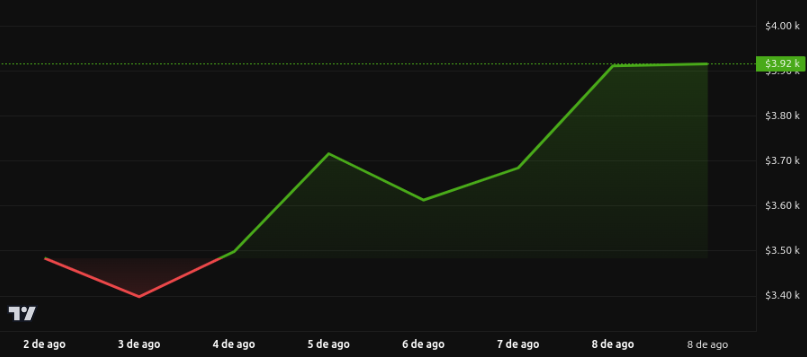 O Ethereum começou a semana com uma forte alta impulsionada por avanços regulatórios e adoção institucional, subindo para US$ 3,9 mil hoje (+5,67%) após o anúncio de Trump. Apesar de uma correção de -4,4% em meio a dados econômicos fracos, a criptomoeda mantém um ganho mensal de 43%.
