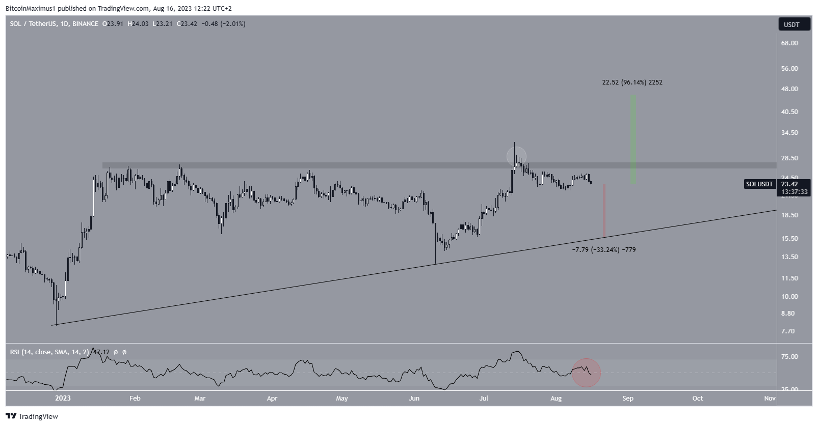 Finalmente, o RSI diário caiu abaixo de 50 e está caindo (círculo vermelho). No período semanal é neutro, no diário é de baixa. Se a queda do indicador continuar, o preço da SOL pode cair mais 33% e atingir uma linha de tendência de alta em US$ 15,40.