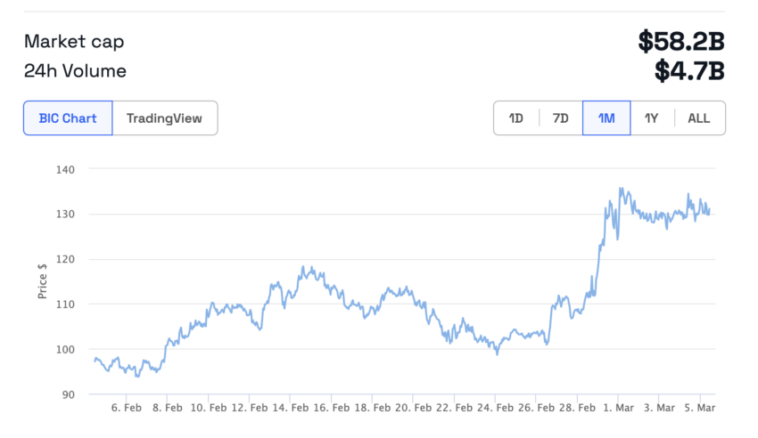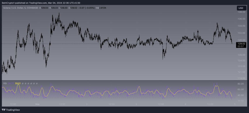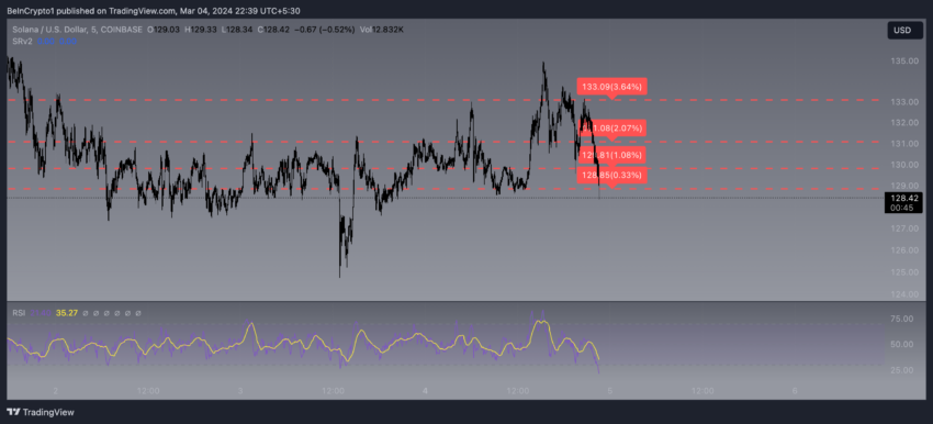 Uma análise do par SOL/USD no gráfico de 5 minutos indica um nível de resistência potencial em US$ 133. Se o preço ultrapassar este ponto, a tendência de alta poderá continuar.