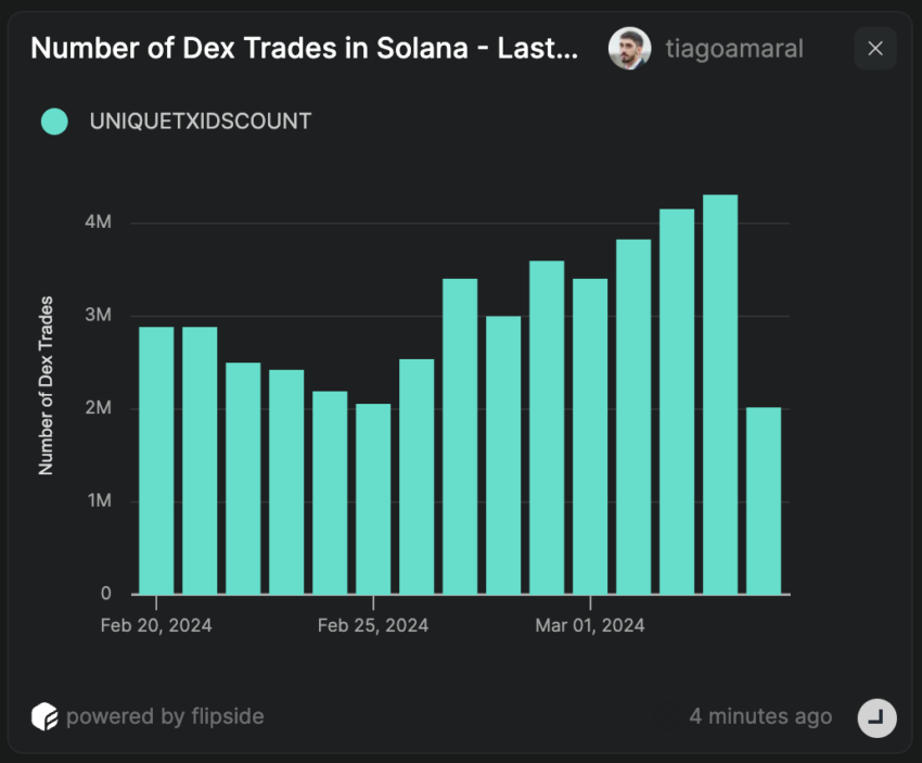 O número de negociações em exchanges descentralizadas (DEX) na rede mostra um quadro semelhante. Tem crescido exponencialmente desde setembro de 2023 e subindo nos últimos 14 dias. Em 20 de fevereiro, o número de negociações DEX era de 2,88 milhões. Essa métrica subiu para 4,31 milhões em 4 de março, um salto de 66% em apenas 14 dias.