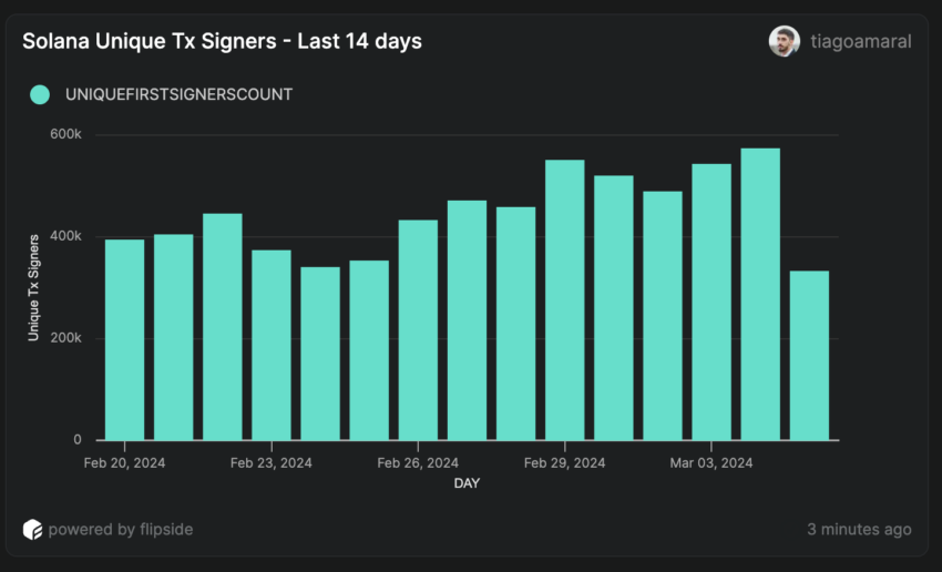 Os assinantes de transações exclusivas da rede Solana têm crescido exponencialmente nos últimos seis meses. O gráfico mostra que essa tendência tem sido considerável nos últimos 14 dias.
