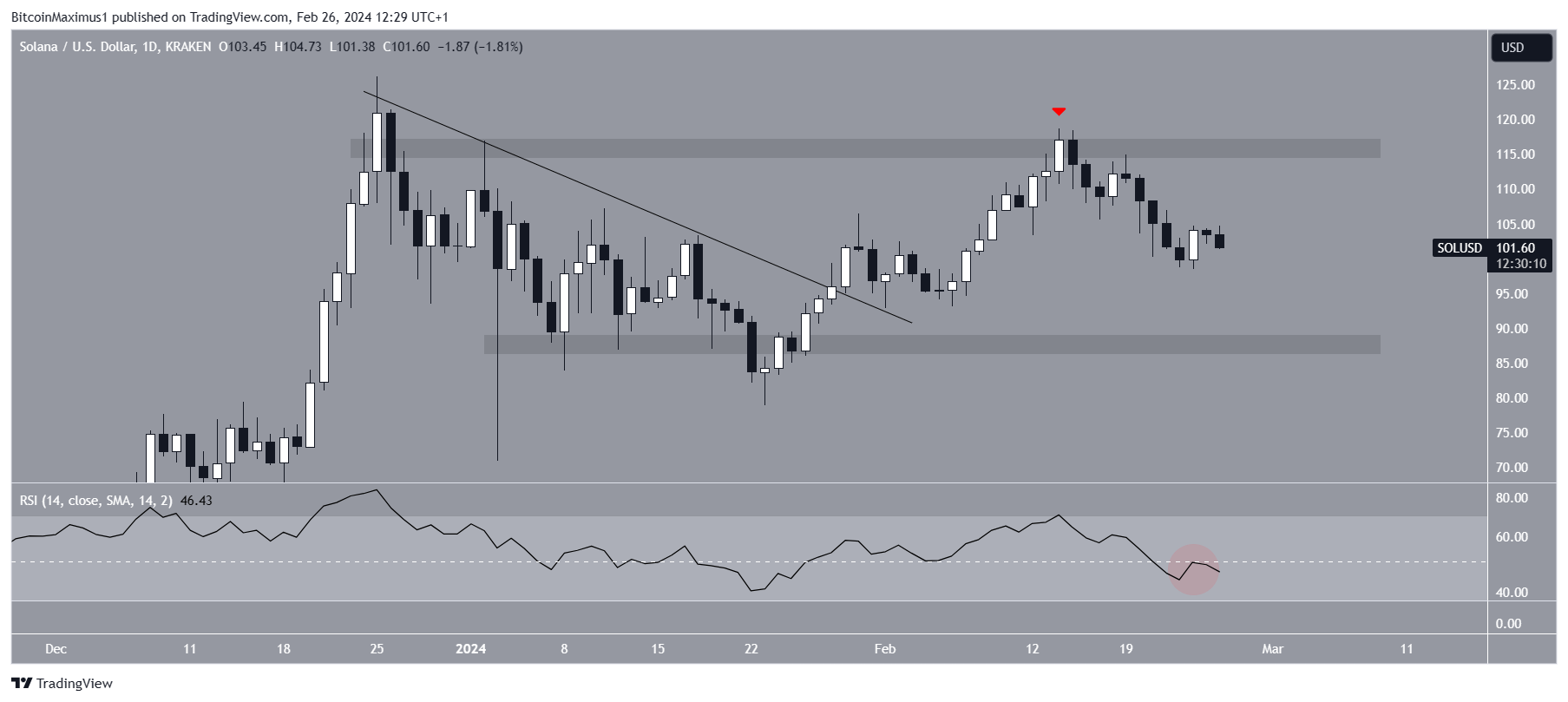 A análise técnica do gráfico diário mostra que a Solana rompeu uma linha de tendência de baixa em 28 de janeiro de 2024. O movimento culminou com uma alta de US$ 119 em 14 de fevereiro.