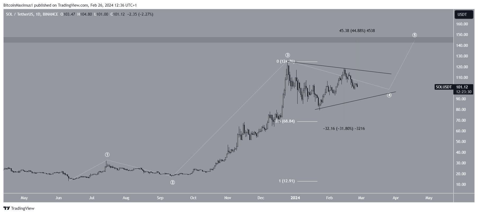 Um rompimento do triângulo confirmará que a onda cinco começou. Nesse caso, a SOL pode subir 45% até a próxima resistência em US$ 145.