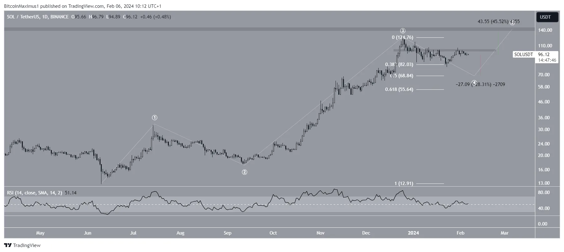 Se a onda quatro não for concluída, a Solana pode cair mais 30%, para o nível de retração de 0,5 de Fibonacci, em US$ 69. Por outro lado, se a onda cinco tiver começado, espera-se que o preço suba 45% para a próxima resistência em US$ 140.
