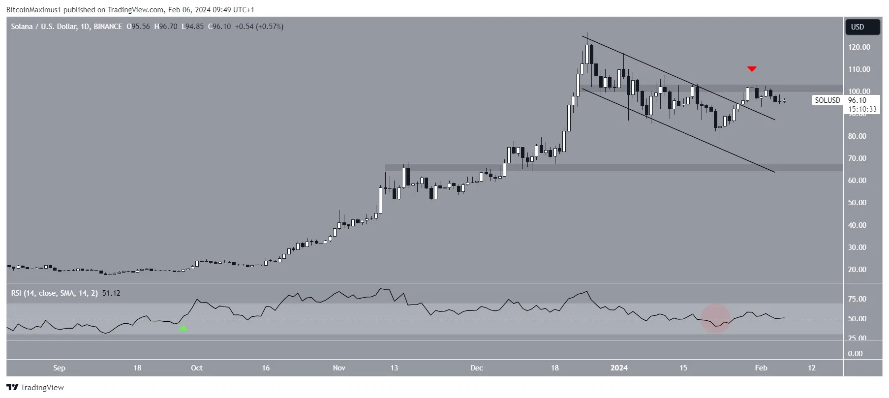 A análise técnica do gráfico diário mostra que o preço da Solana caiu estava dentro de um canal paralelo de baixa desde 25 de dezembro. O movimento levou a uma mínima de US$ 79 em 23 de janeiro de 2024.