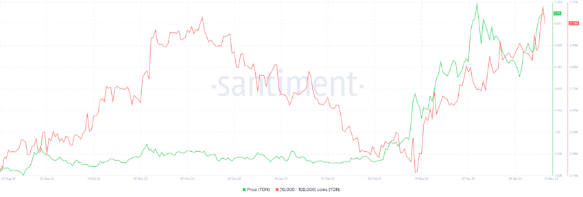 Em cinco dias, os endereços que detêm entre 10.000 e 100.000 TON adicionaram mais de 350.000 moedas. Esse montante de US$ 2,5 milhões é o maior volume de compras observado em uma semana desde meados de março.