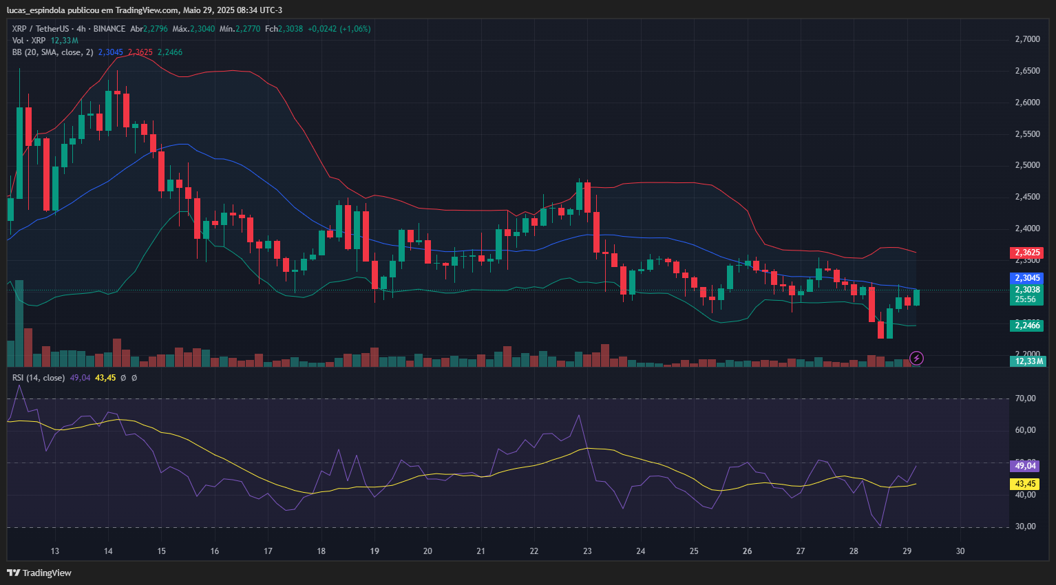 O gráfico de 4 horas do par XRP/USDT indica uma tentativa de recuperação após uma sequência de sessões dominadas pela pressão vendedora. O preço chegou a atingir US$ 2,24, tocando a banda inferior das Bandas de Bollinger, região que historicamente atua como suporte técnico e área de interesse comprador.