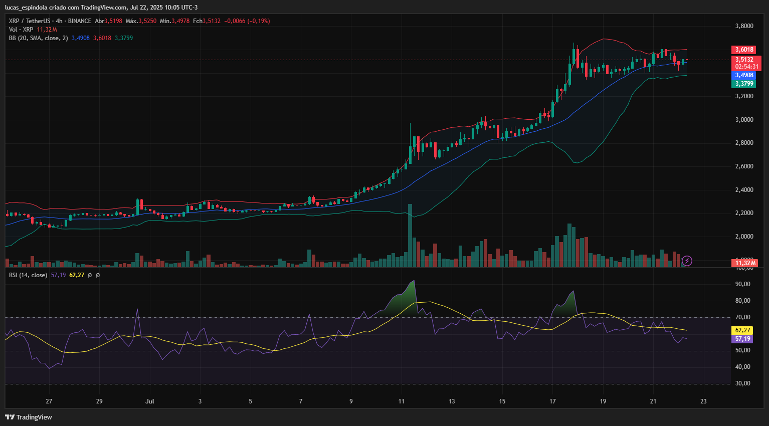 O XRP está em fase de consolidação após registrar um forte rali, que levou o preço acima de US$ 3,50. O movimento de alta perdeu força nos últimos dias, o que pode indicar um momento de pausa antes de uma nova tendência. No gráfico de 4 horas, o ativo mantém topos e fundos ascendentes, estrutura técnica que sinaliza uma possível continuação da alta.