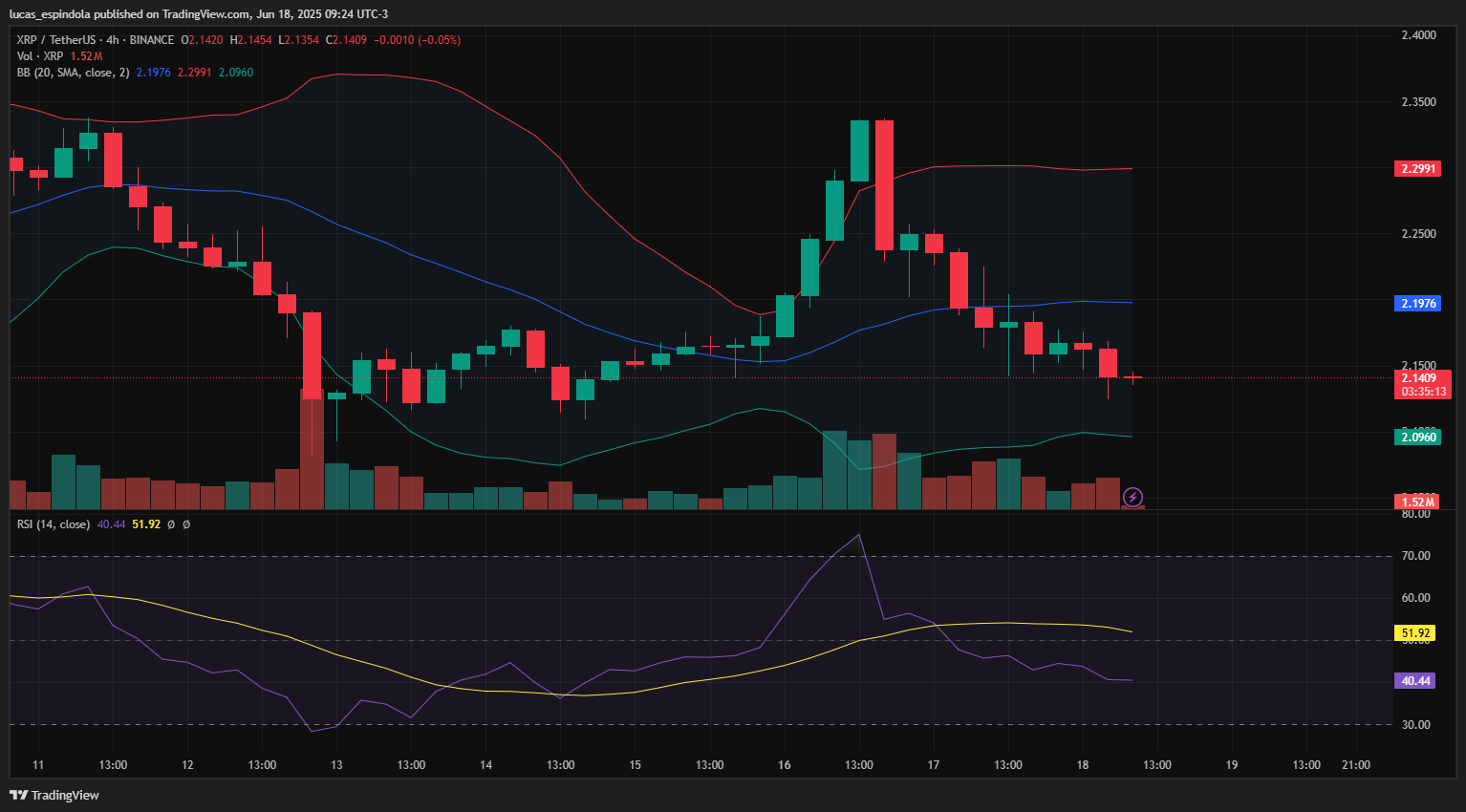 SponsoredAlém disso, a banda inferior das Bollinger está se aproximando da região de US$ 2,09, o que pode funcionar como um suporte adicional caso o XRP perca o patamar de US$ 2,10.