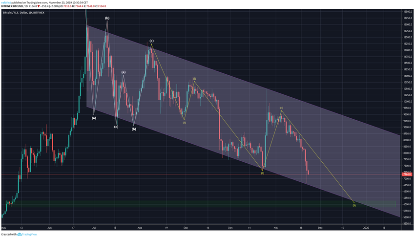 É possível que a correção termine perto de US $ 6000, na linha de suporte deste canal e na área de suporte anterior.