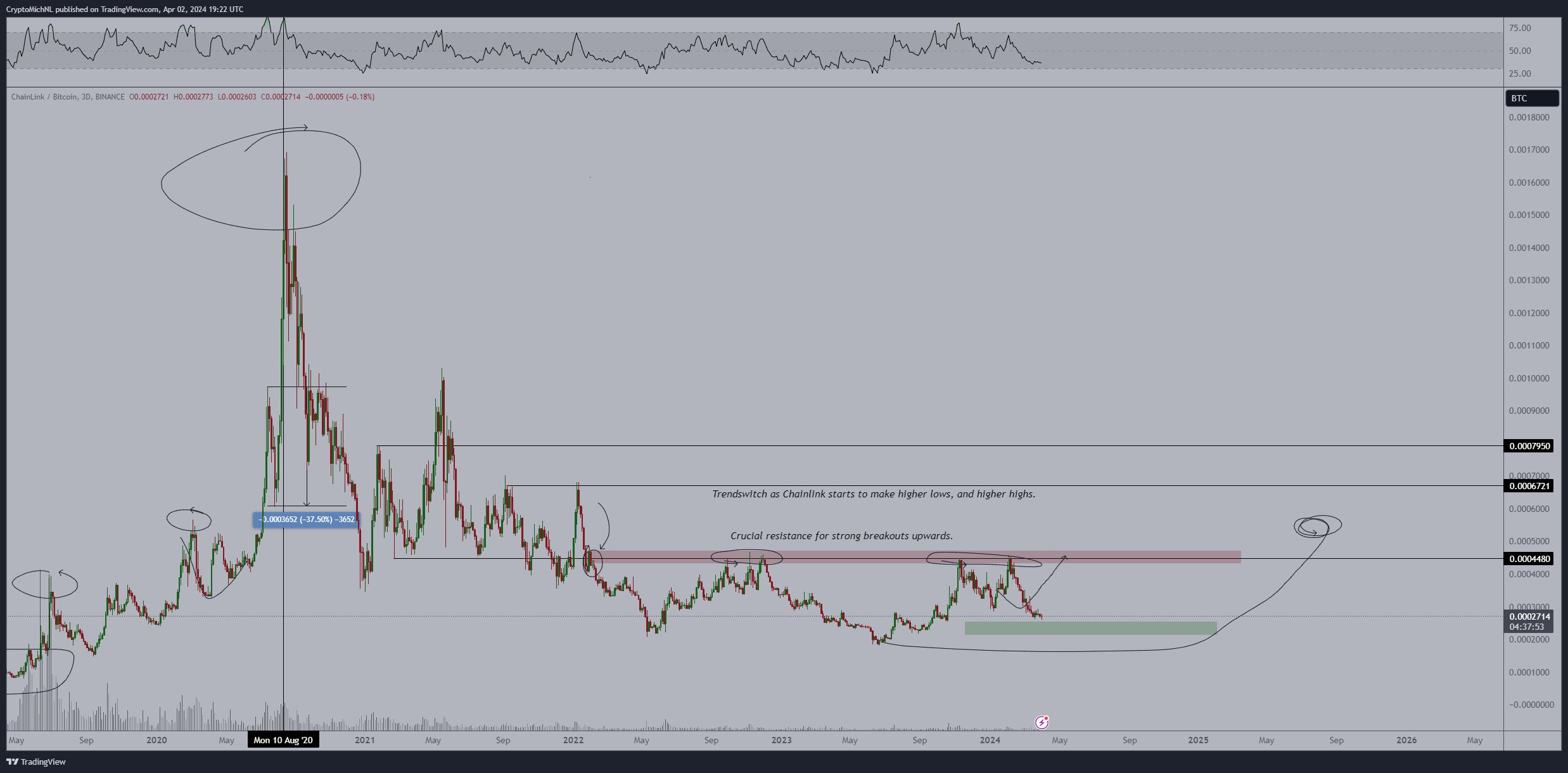 A Chainlink está em baixa cíclica. A queda da criptomoeda em relação à máxima local chegou a 40%, abrindo uma boa oportunidade para a compra da altcoin.