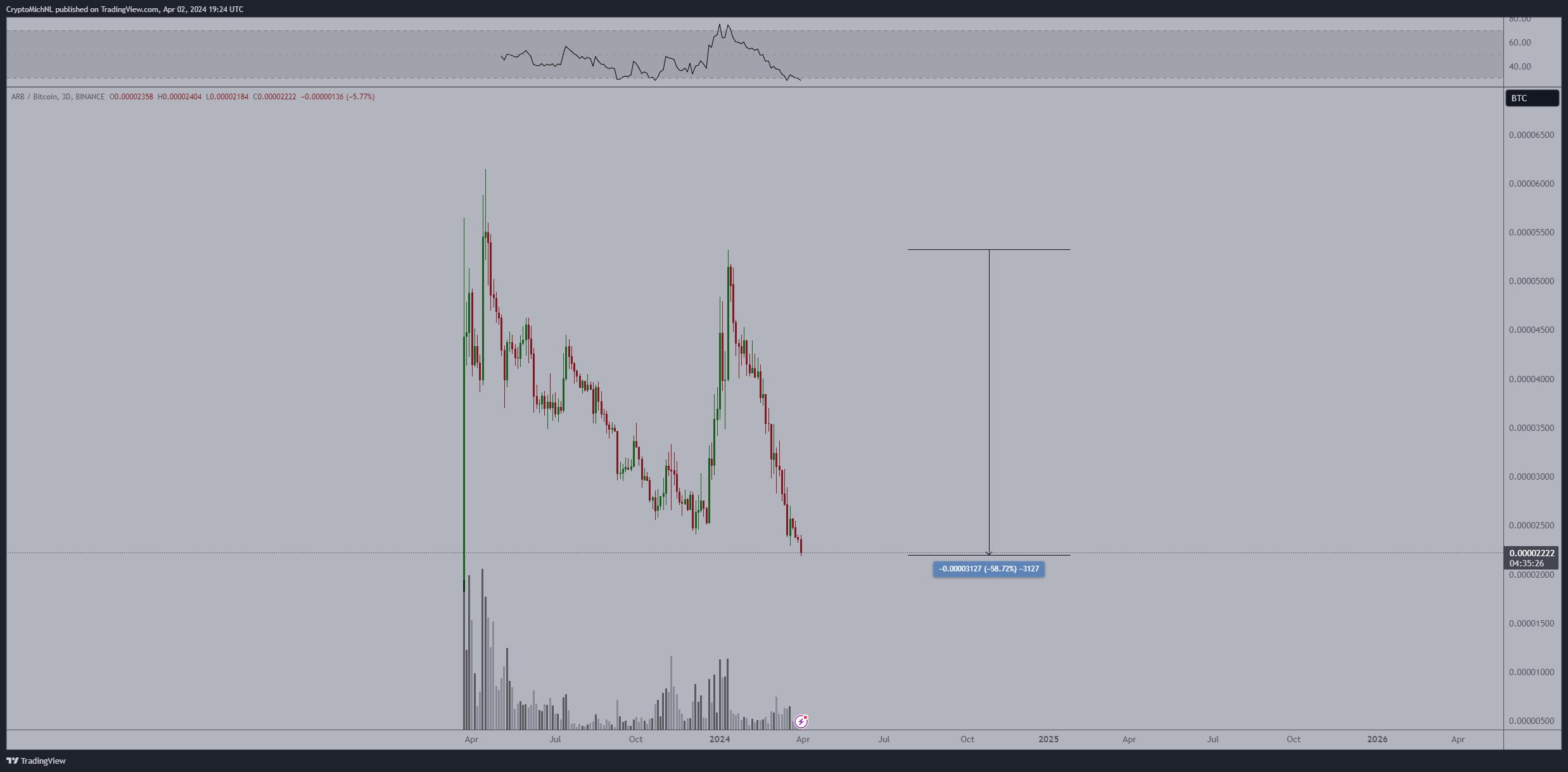 O ARB sofreu uma grande queda devido ao lançamento de um grande volume de tokens no mês anterior. A profundidade total do preço da criptomoeda desde o topo local atingiu 60%.