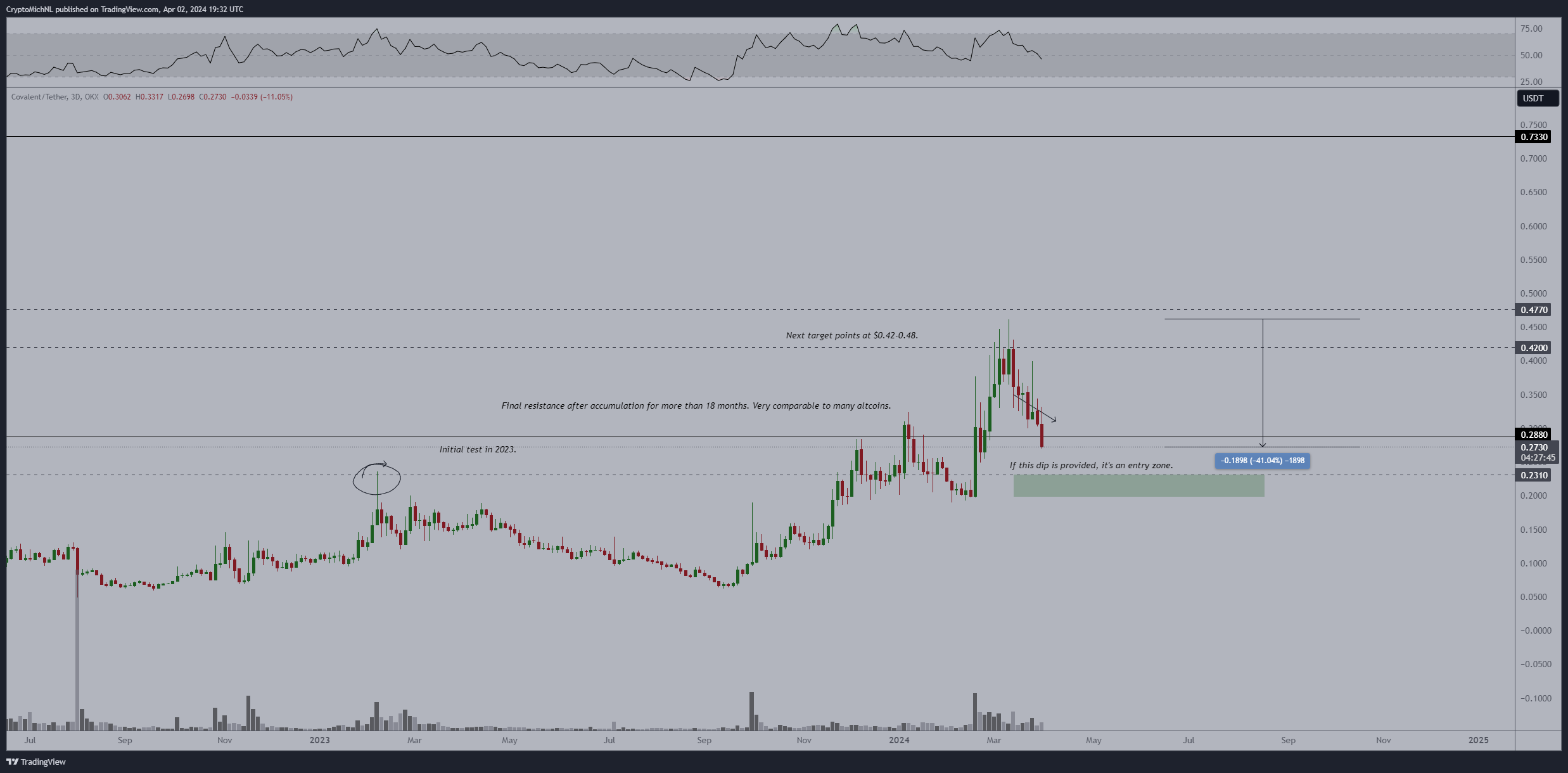 A criptomoeda está se movendo lateralmente. No entanto, ela possui perspectivas de subir para o próximo nível de resistência, que está localizado em +240% do seu preço atual.