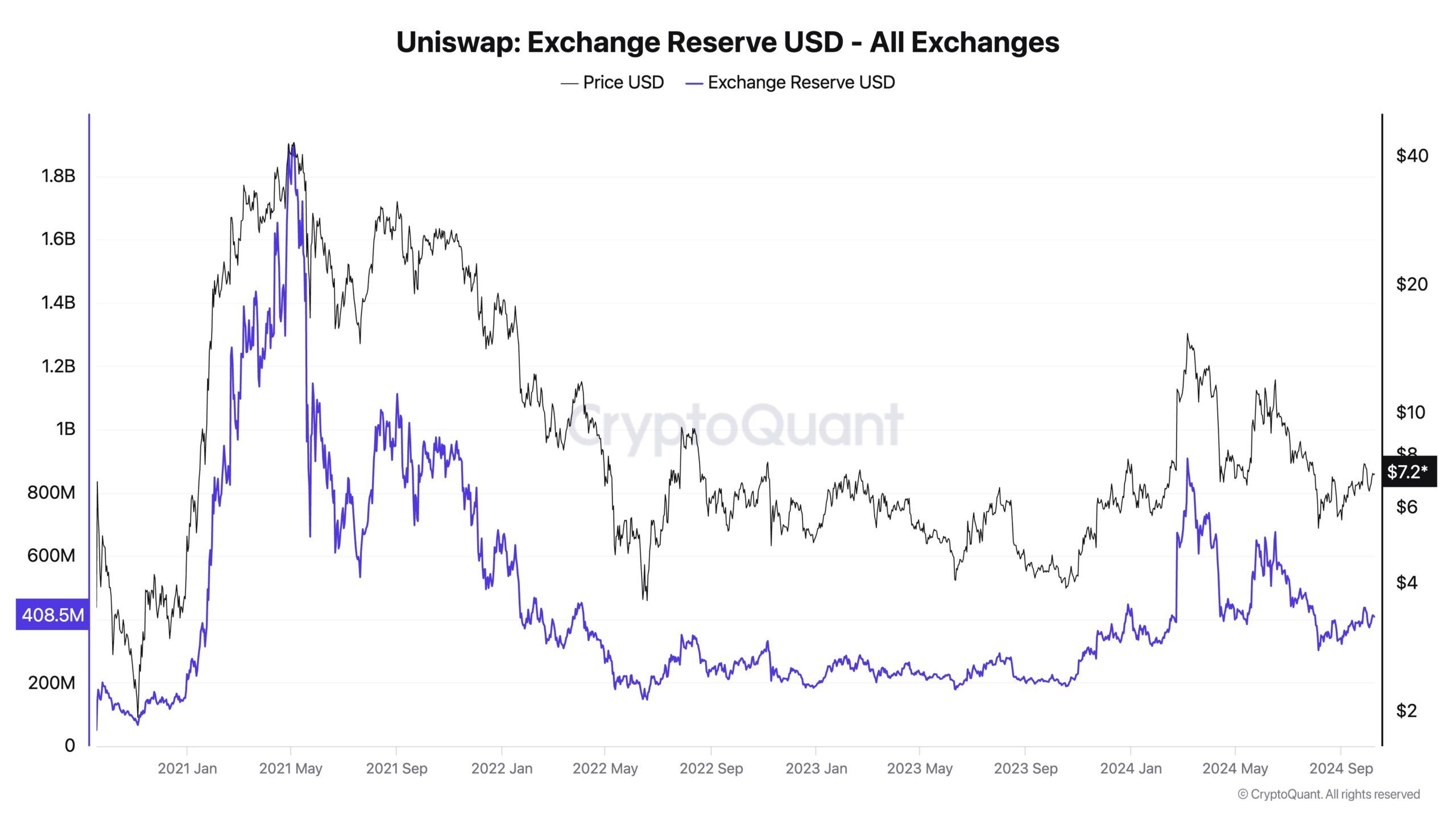 Por exemplo, se a troca de taxas da Uniswap tivesse sido ativada, seu tesouro poderia ter US$ 314 milhões. Atualmente, há US$ 408 milhões em UNI em exchanges centralizadas. Se o tesouro fosse usado para recompras, os preços poderiam ter disparado de 10x a 100x, dependendo da profundidade do livro de ofertas. (Não é um conselho financeiro; não possuo UNI.), Ki Young Ju explicou.