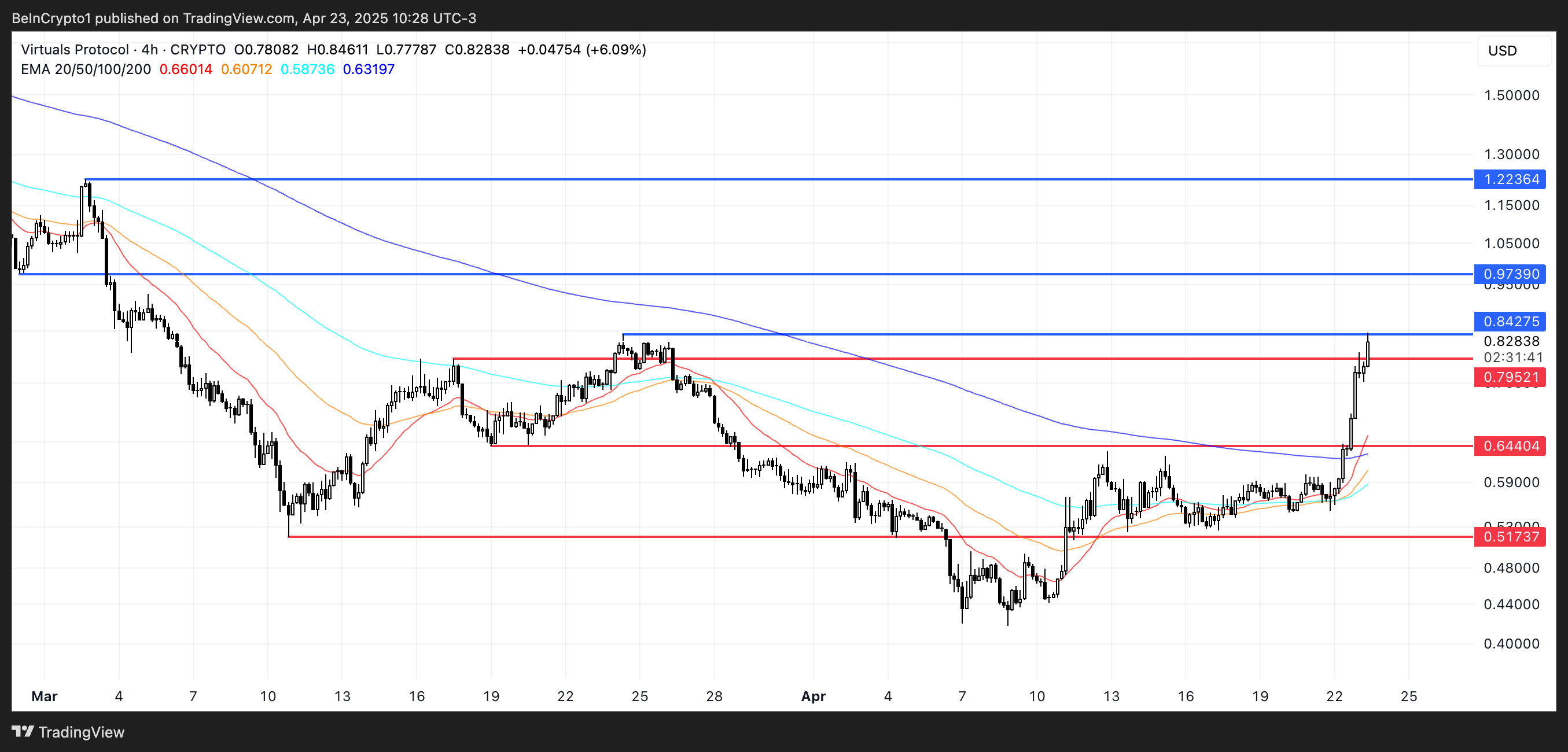 Sponsored SponsoredSe a criptomoeda conseguir superar a resistência de US$ 0,84, o próximo alvo seria US$ 0,97. Se o sentimento de mercado continuar positivo e o entusiasmo pelos agentes de IA cripto voltar a crescer, um movimento rumo a US$ 1,22 se torna viável — representando sua primeira vez acima de US$ 1 desde março.