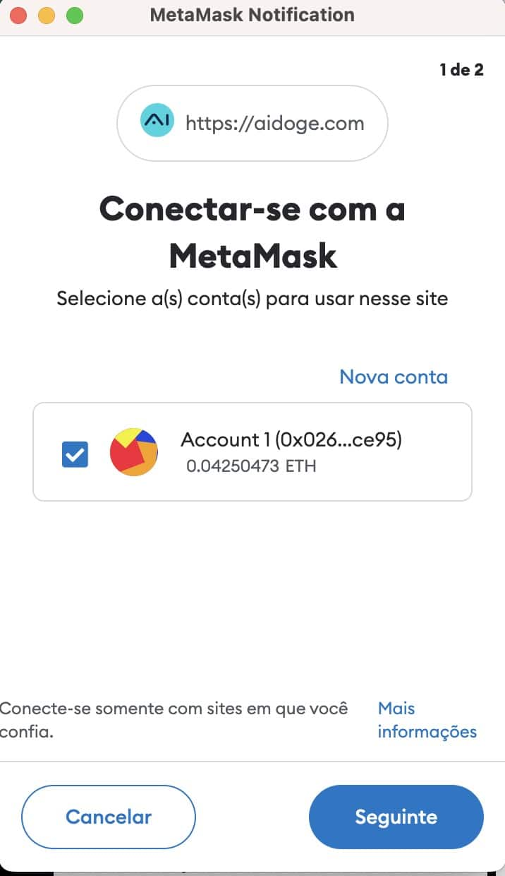 Assim que a carteira estiver conectada ao website de AiDoge, mais uma confirmação será solicitada. Dessa vez, para aprovar a transação, o que significa que os tokens serão deduzidos da sua carteira cripto.
