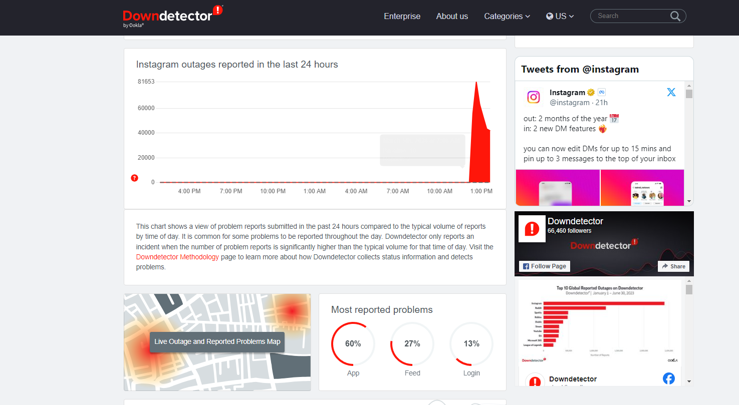 Por volta de 1 PM passava dos 90.000 as queixas sobre problemas com Instagram.