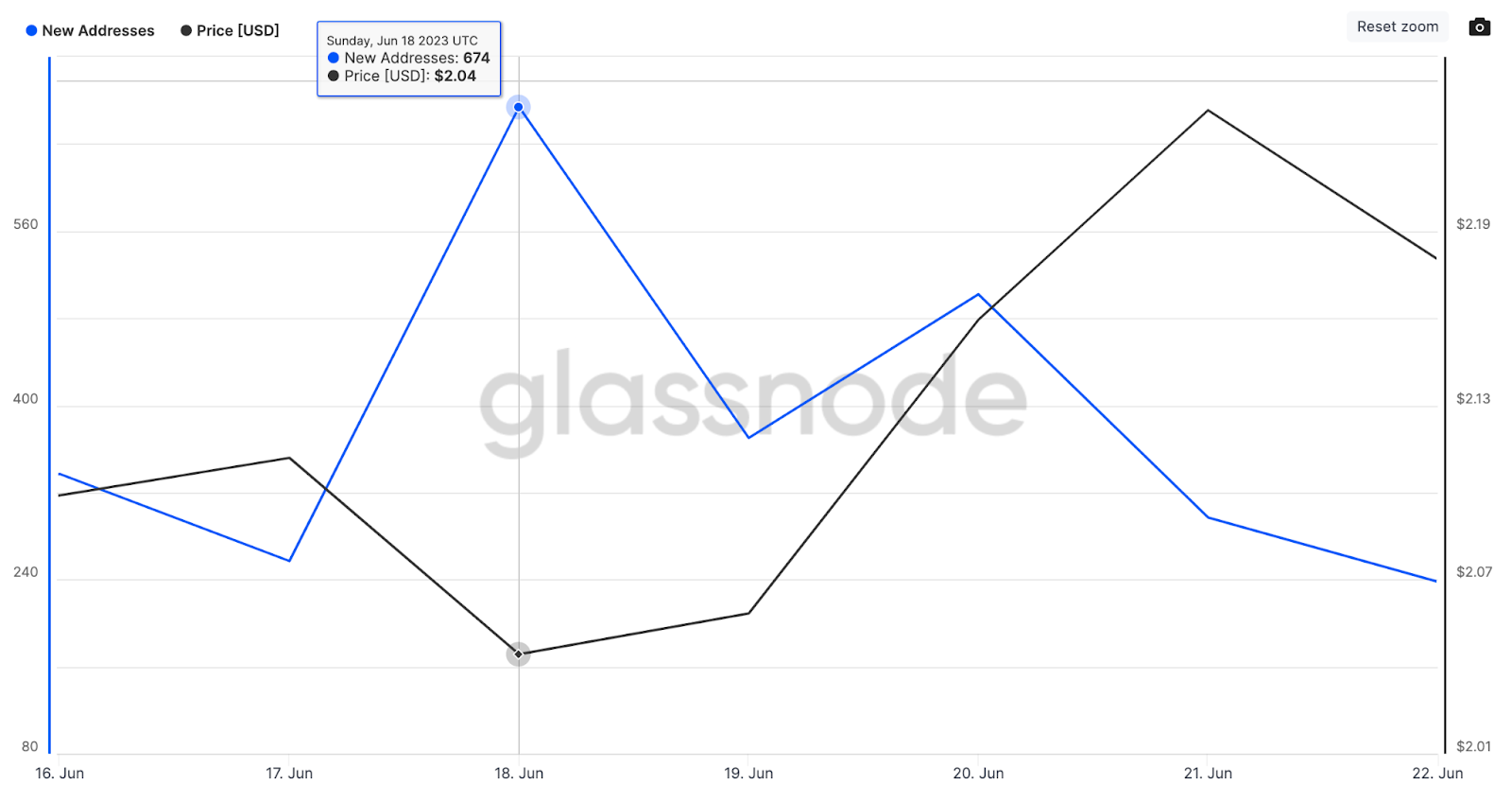 Com o ecossistemaNFT perdendo força, a Ape Coin luta para atrair novos usuários esta semana. Os dados da Glassnode abaixo mostram que o crescimento da rede diminuiu a partir de 18 de junho, quando o preço mínimo do BAYC e o volume de negociação começaram a cair.