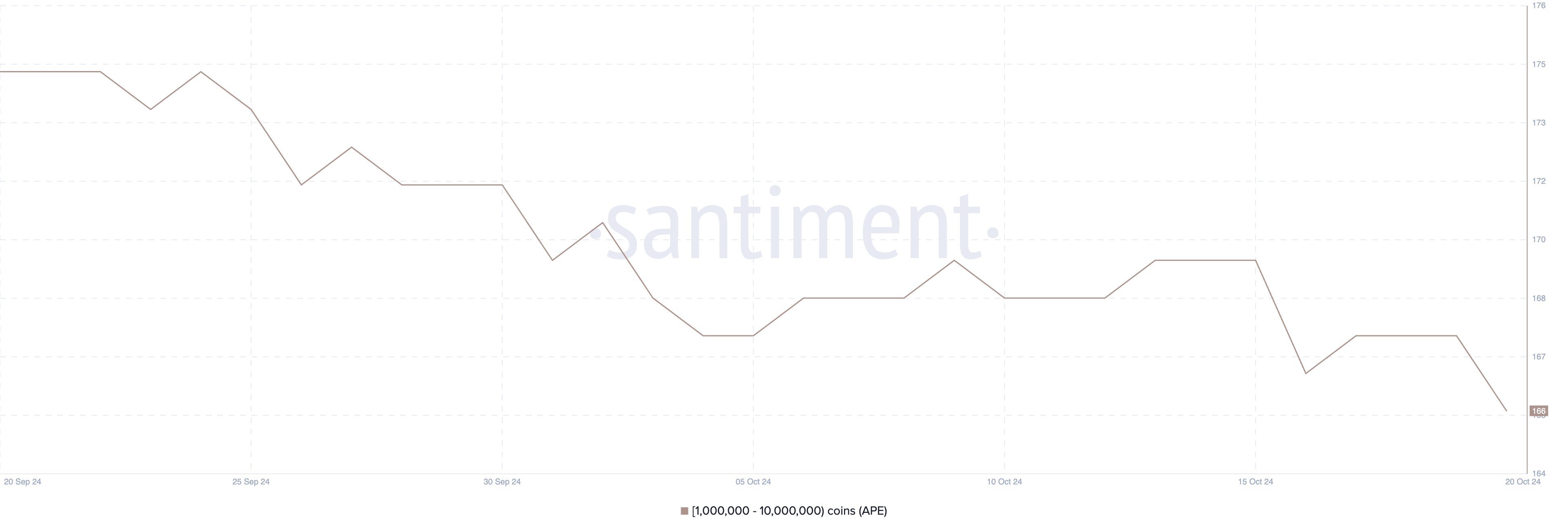 Apesar do entusiasmo em torno do lançamento da Apechain, o número de carteiras acumulando grandes quantidades de tokens não está aumentando. Especificamente, a contagem de detentores com entre 1 e 10 milhões de APE vem diminuindo constantemente, caindo de 175 no dia 20 de setembro para 166 no dia 20 de outubro.