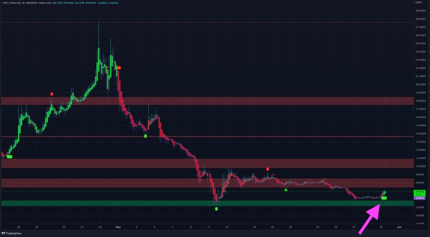 O trader de criptomoedas @MTI_Trading twittou um gráfico da APE, afirmando que, apesar do aumento, o preço ainda enfrenta resistência significativa em US$ 8.