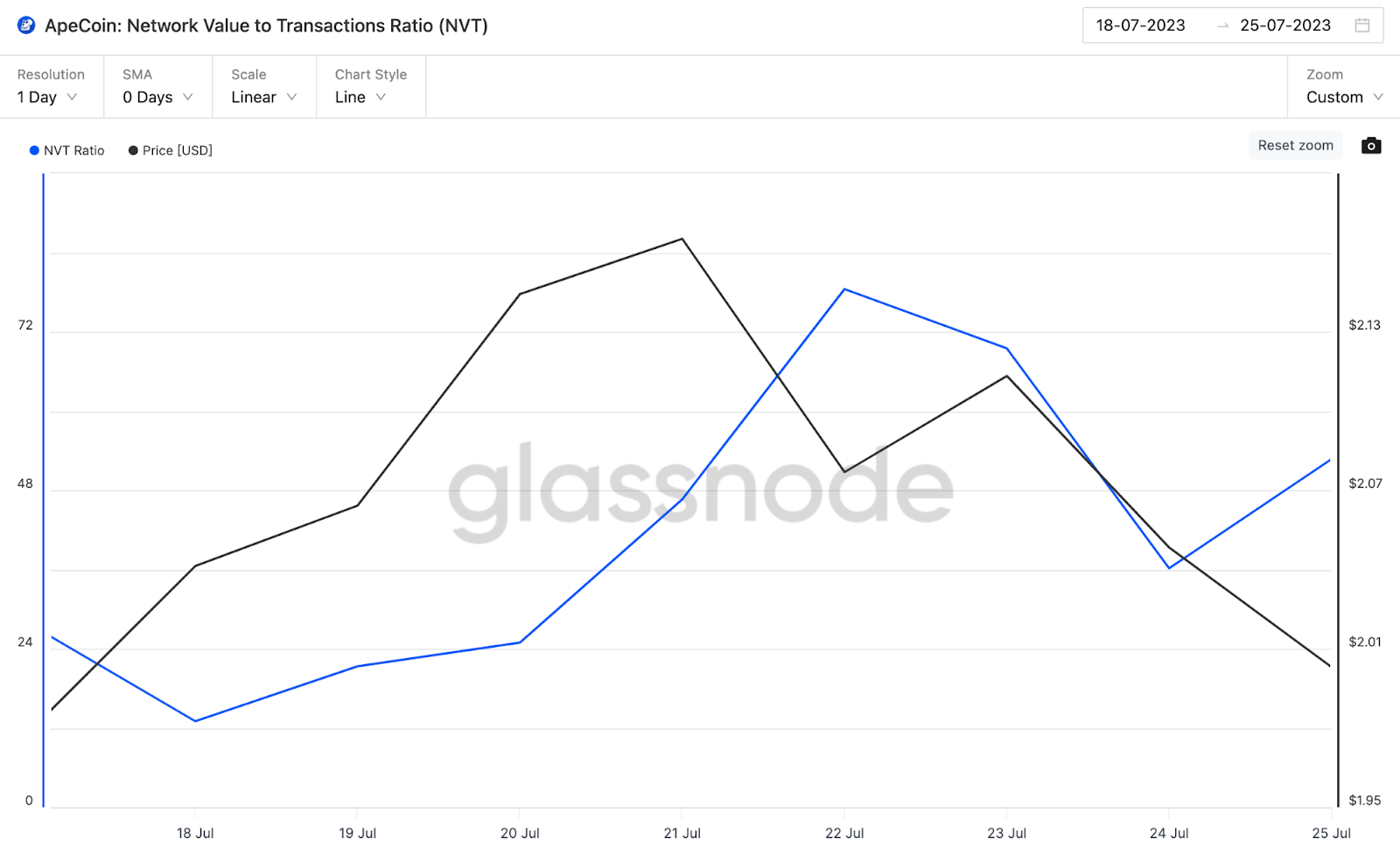Em confirmação da perspectiva de baixa, a relação Network Value to Transaction Volume (NVT) sugere que a ApeCoin agora está se aproximando da zona de sobrecompra. Entre 18 e 26 de julho, aumentou 300%, de 13,03 para 52,72.