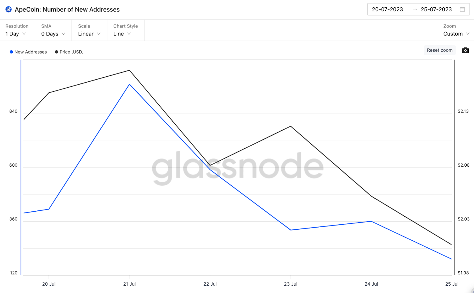 A Glassnode disse que a ApeCoin registrou apenas 190 novos endereços de carteira em 25 de julho. Esta é a menor taxa de aquisição de usuários desde 29 de maio, quando registrou 176 novos endereços de carteira.