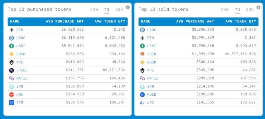 A ApeCoin está no top 10 dos tokens mais comprados e transacionados em carteiras ETH (embora às vezes suba para a primeira posição) e a partir de quinta-feira (24) é a quinta mais comprada, com um valor médio de compra de US$ 613.893 nos últimos sete dias.