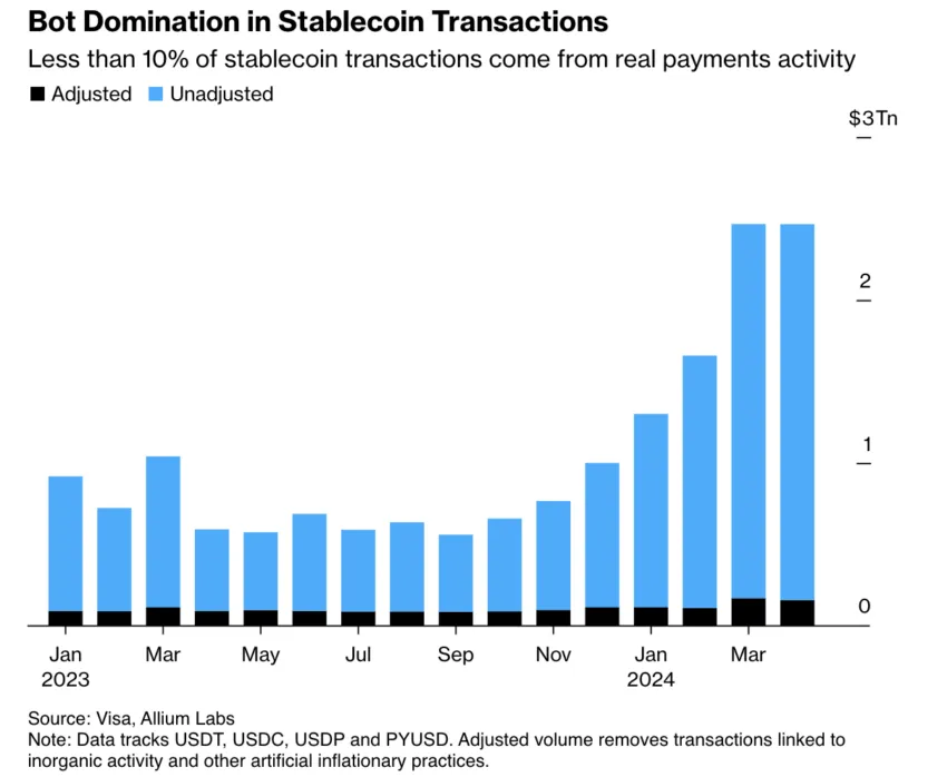 A Visa e o Allium Labs afirmam que apenas 10% das transações de stablecoins em abril são autênticas. Esta descoberta sugere que esses ativos ainda estão longe de se tornarem um método de pagamento amplamente aceito.