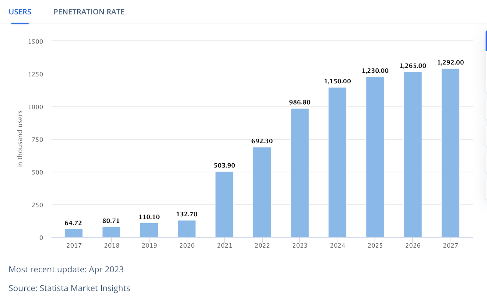 De acordo com Statista, havia 692.000 usuários de criptomoedas na Irlanda em 2022. No entanto, estima-se que o número quase dobre até 2027, com cerca de 1,2 milhão de usuários.