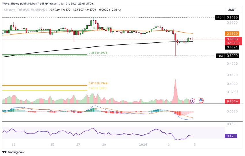 Gráfico 4H de Cardano mostra o preço no nível de suporte crucial 200-4H EMA