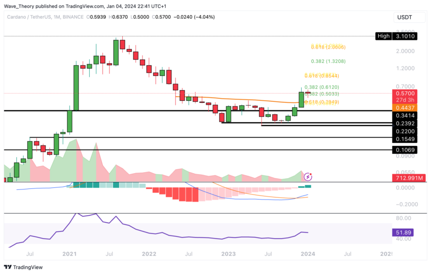 Caso Cardano sofra mais correções, um nível importante a ser observado é a EMA de 50 meses, que está em torno de US$ 0,444. Este nível poderia ser um apoio significativo, estabilizando potencialmente o preço ou mesmo fornecendo uma base para uma recuperação.