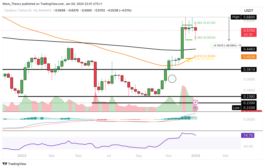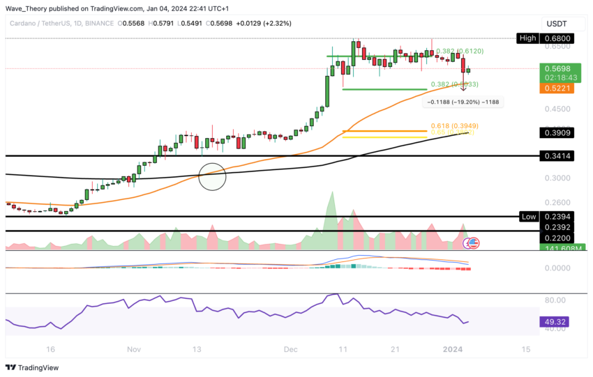 Após ultrapassar o nível de resistência de 0,382 de Fibonacci (Fib) em aproximadamente US$ 0,612, a Cardano experimentou uma rejeição de baixa, com o preço caindo cerca de 19,2% ontem.