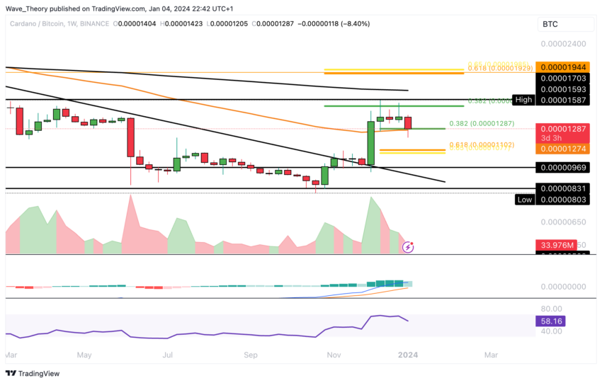 Em suas negociações contra o Bitcoin (BTC), a ADA está atualmente encontrando suporte notável na convergência do nível 0,382 de Fibonacci (Fib) e da EMA de 50 semanas, em torno de 0,00001275 BTC. Se este nível de suporte falhar, o próximo suporte significativo de Fibonacci é esperado em torno de 0,000011 BTC.
