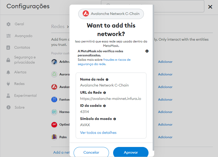 Após clicar no botão “adicionar rede” você vai ser redirecionado para outra página. Escolha entre adicionar a rede Avalanche automaticamente.