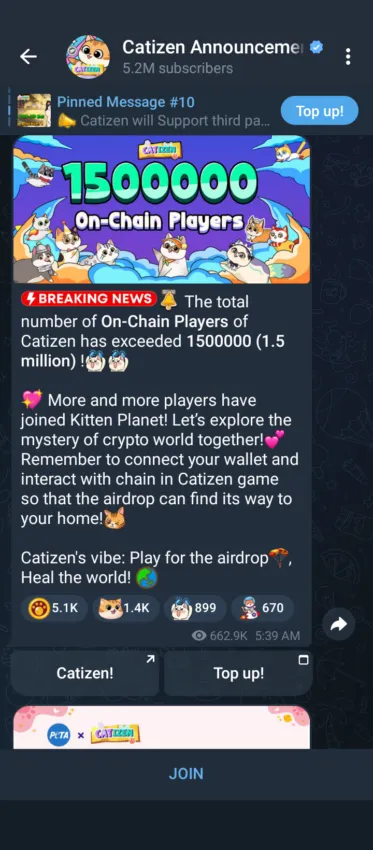 Use apenas canais oficiais para farmar airdrops e tenha cuidado com canais ou contas que entram em contato com você alegando fazer parte da equipe oficial do Catizen.