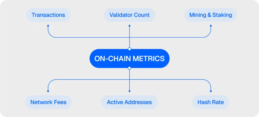 Métricas on-chain focam em dados relacionados a rede blockchain, dando insights sobre o uso da rede e atividade dos usuários. As principais incluem: