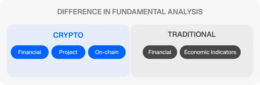 Para ativos tradicionais, a análise fundamental usa demonstrações financeiras e relatórios de receita. Em cripto, no entanto, ela se concentra em métricas on-chain, como volumes de transação e tokenomics (oferta, distribuição e gerenciamento de tokens).
