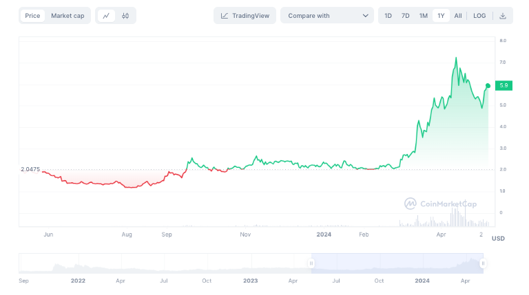 A Toncoin tem uma oferta máxima de 5 bilhões. Em 7 de maio de 2024, a criptomoeda estava sendo negociada a US$ 5,82, com uma capitalização de mercado de US$ 20.220.305.511, de acordo com dados do CoinMarketCap. A cripto atingiu uma alta histórica em 11 de abril de 2024, atingindo US$ 7,65.