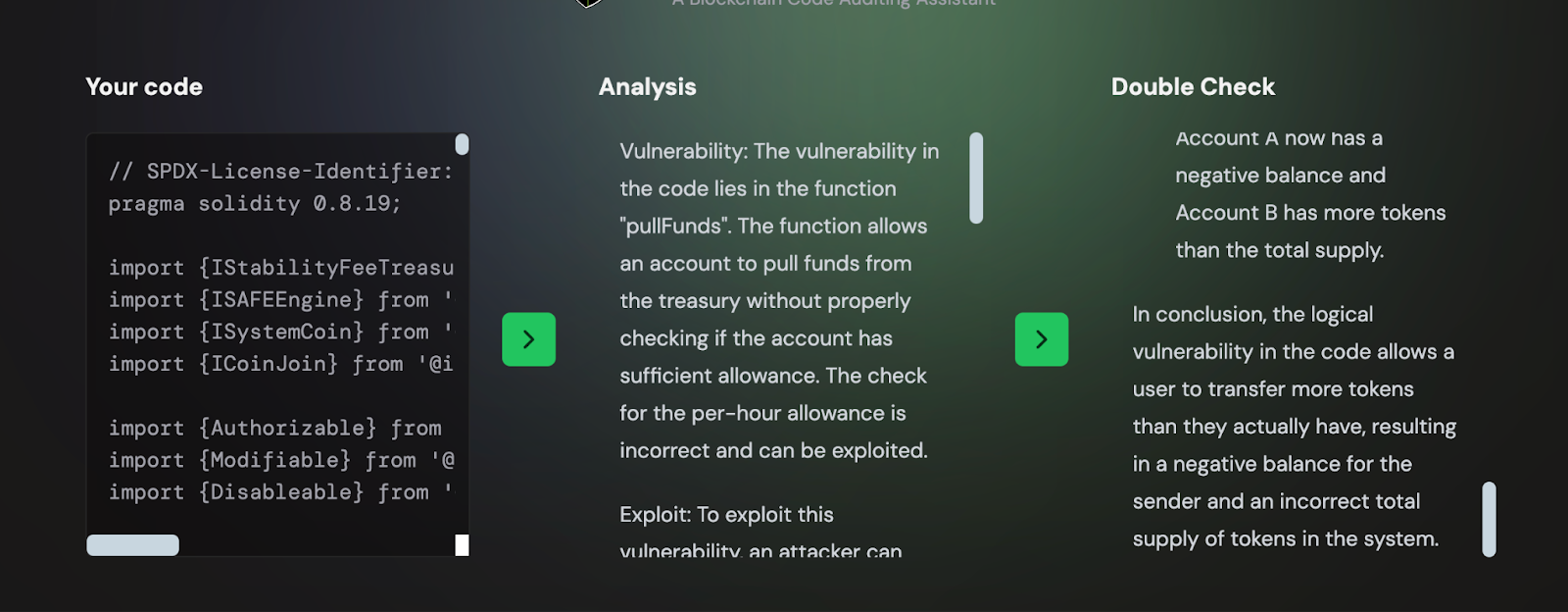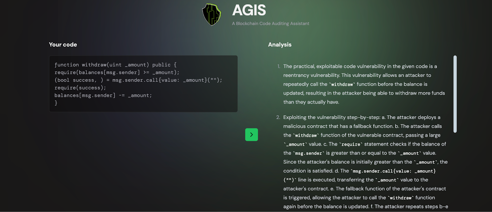 Os desenvolvedores podem inserir seu código de contrato inteligente, e o AGIS irá analisá-lo, destacando quaisquer falhas de segurança e sugerindo melhorias. Assim, potenciais explorações podem ser prevenidas, e a segurança do contrato pode ser garantida.
