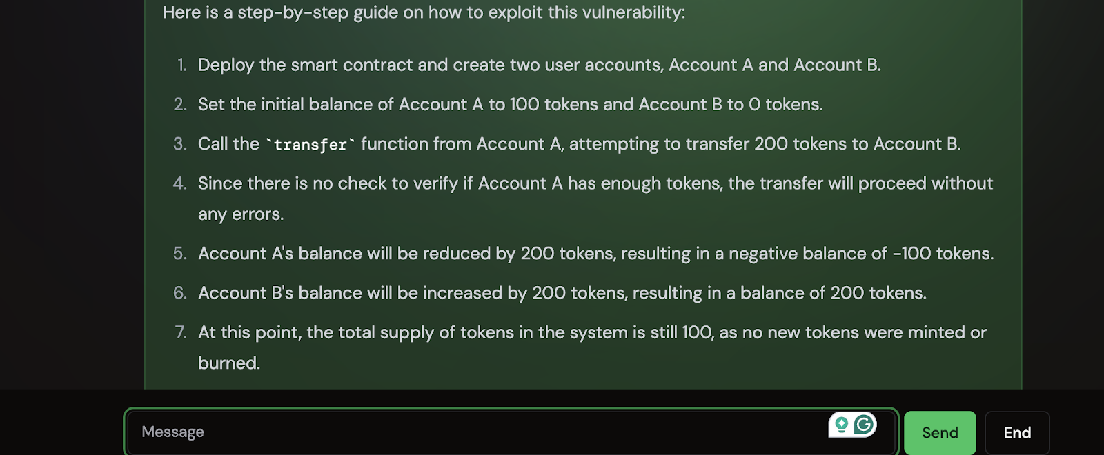 Imagine que você é um desenvolvedor trabalhando em um novo aplicativo de finanças descentralizadas (DeFi). Para garantir que seu contrato inteligente seja seguro, você pode usar o AGIS para auditar o código em busca de vulnerabilidades. Abaixo está um exemplo de código com bugs que o AGIS pode ajudar a identificar: