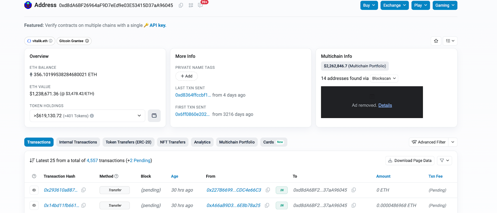 Acima está o endereço da carteira de Vitalik Buterin e suas transações iniciadas recentemente. O Wallet Checker permite que você copie cada endereço e verifique se tudo está alinhado ou se há algum sinal de alerta.