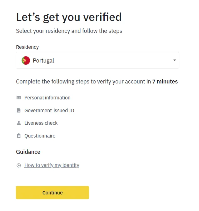 Faça login em sua nova conta Binance. Confirme seu país de residência e preencha seus dados pessoais, como nome completo, data de nascimento e endereço residencial.