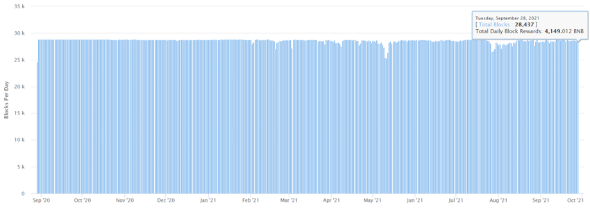 Em troca da proteção da rede e do manuseio das transações, o APY (rendimento percentual anual) da BSC é de cerca de 13%. No entanto, nem todo mundo pode ter o privilégio de obter uma BSC. Em 28 de setembro, a recompensa média diária do bloco na BSC era de 4.149 BNB, ou cerca de US $ 1,5 milhão.
