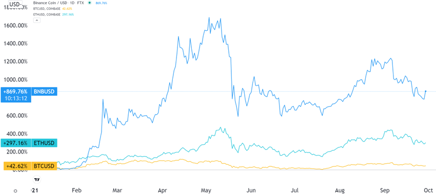 Inicialmente, era possível obter 2.700 BNB para um único ETH ou 20.000 BNB para um único BTC. No acumulado do ano (YTD) desde então, a BNB superou o Bitcoin em 825% e o Ethereum em 572%.