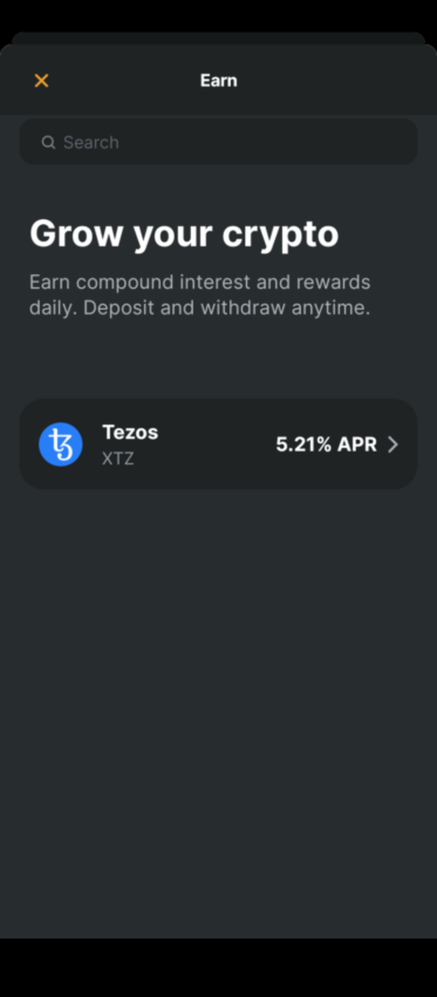 O Zengo atualmente suporta apenas staking de tezos. Quando você for fazer staking de suas moedas, procure a guia “Ganhar” em vez de “staking”.