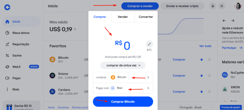 Agora que você já fez o seu primeiro depósito via PIX na Coinbase, você pode comprar as criptomoedas da sua escolha. Para isso, clique no botão “comprar e vender“. Insira o valor em reais que você quer comprar, selecione o BTC e informe como vai pagar. O botão “pagar com” te mostra as opções de pagamentos disponíveis, você pode utilizar o seu cartão de crédito para comprar criptomoedas ou você pode utilizar o seu saldo em reais que foi depositado via PIX. Selecione a opção “real” e clique em “comprar“.