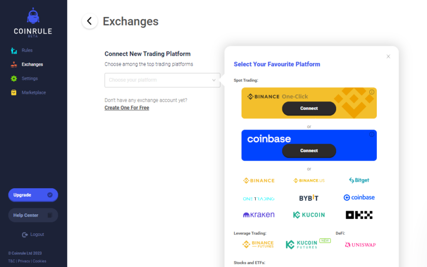 - Compatibilidade com exchanges: O Coinrule integra as principais exchanges de criptomoedas, como a Binance, a Coinbase e o KuCoin.