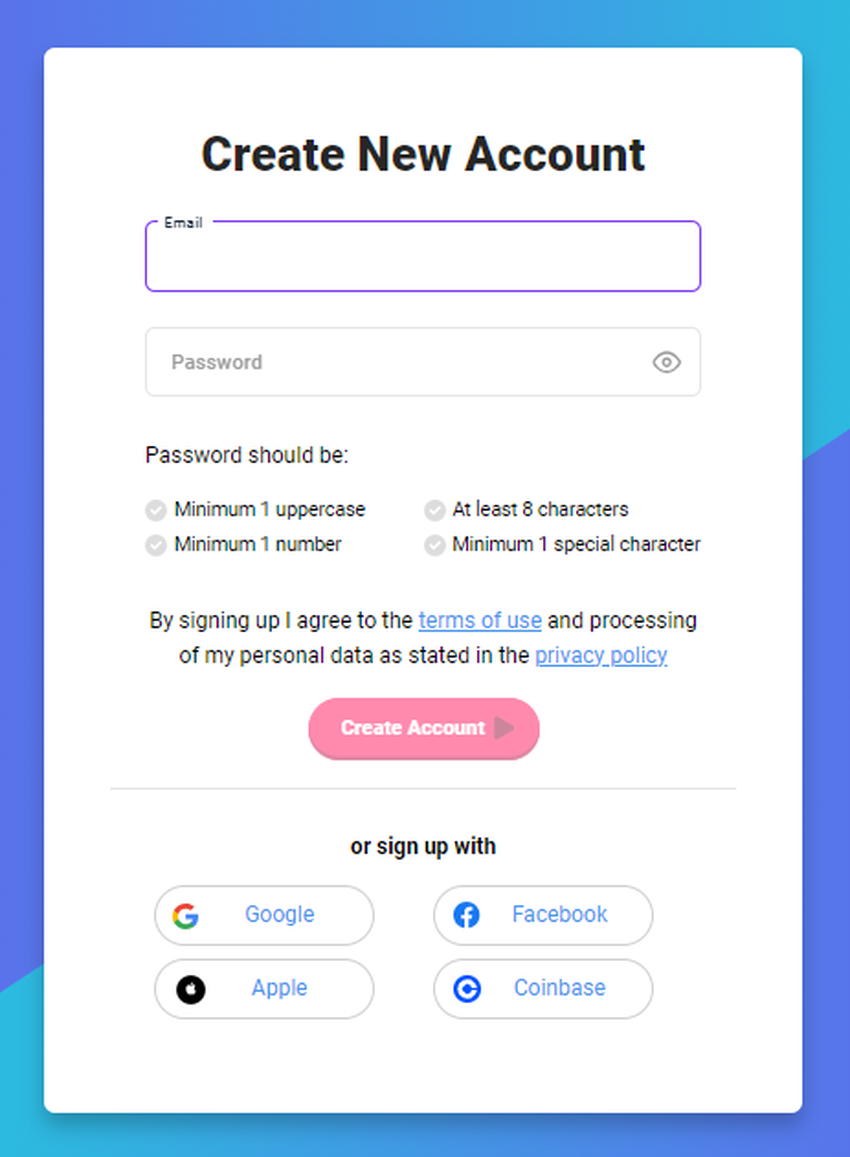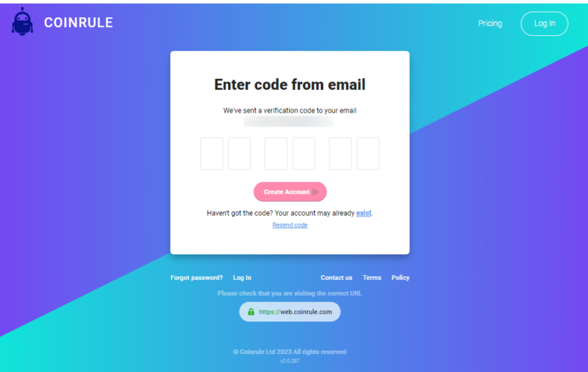 1. Em primeiro lugar, acesse o site do Coinrule e selecione “Inscreva-se”. Você pode se inscrever usando verificação de conta de terceiros (por exemplo, Google, Facebook, etc.) ou pode inserir seu e-mail e criar uma senha.