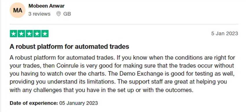 Por outro lado, o TrustPilot também mostra uma série de comentários positivos destacando um atendimento ao cliente ágil e útil. Alguns usuários elogiaram a equipe de suporte do Coinrule por suas respostas rápidas, gentileza e assistência eficaz na resolução de problemas. Eles descreveram o atendimento ao cliente como “super responsivo” e “excelente”.